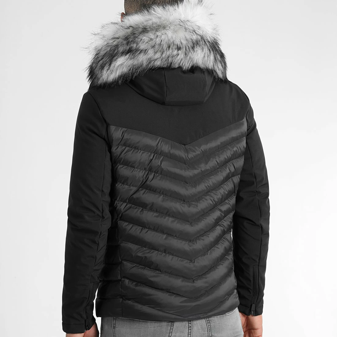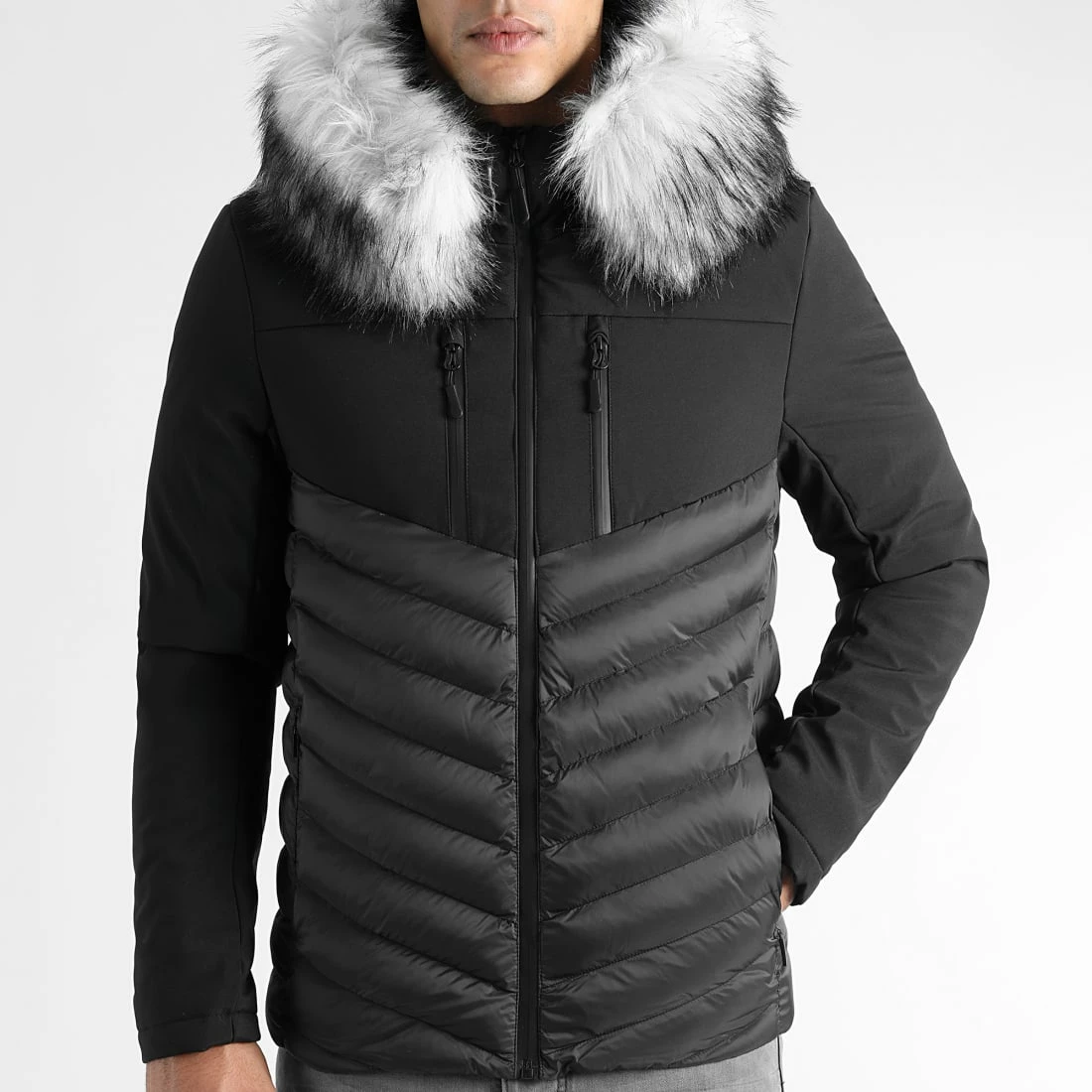 • Doudoune capuche bi-matière rembourrée avec fourrure synthétique amovible par boutons pression