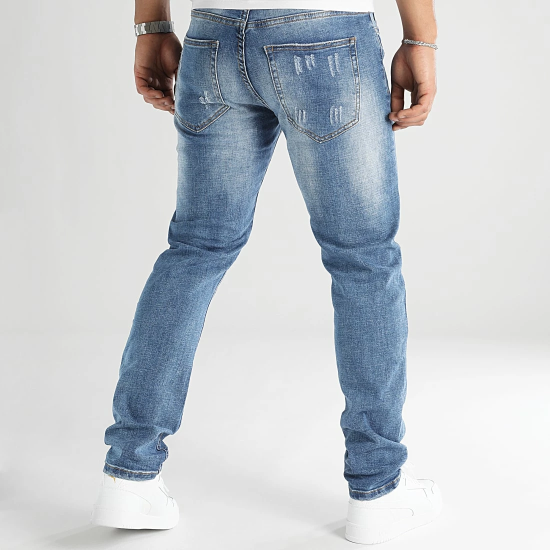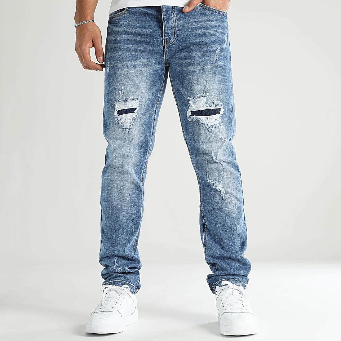 • Jean regular finition usée et délavée avec rapiéçages