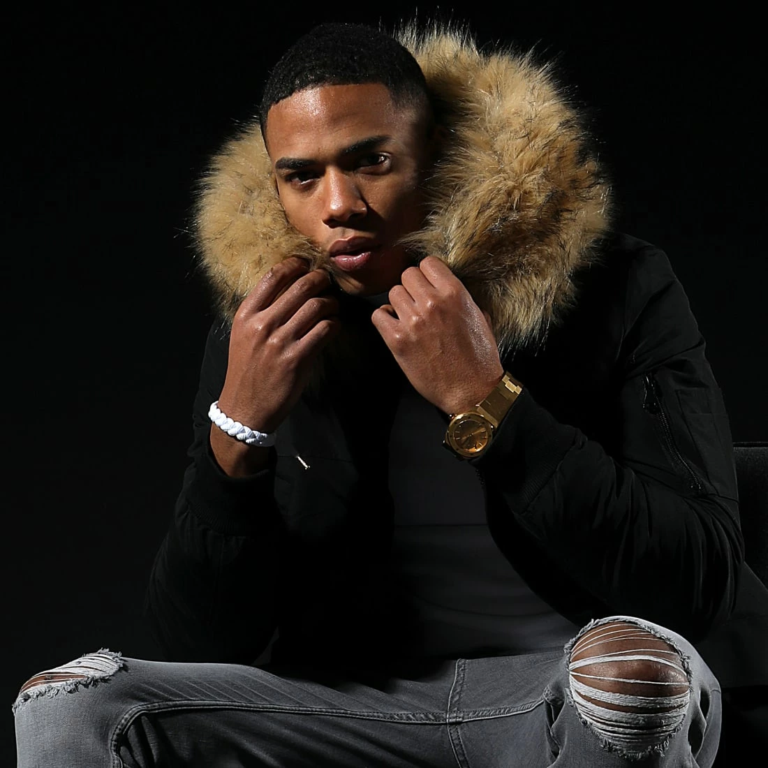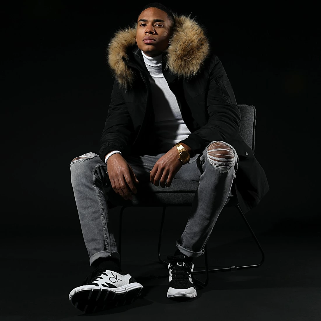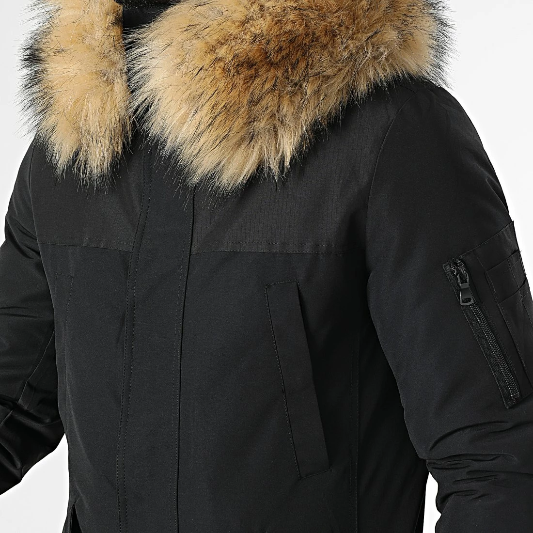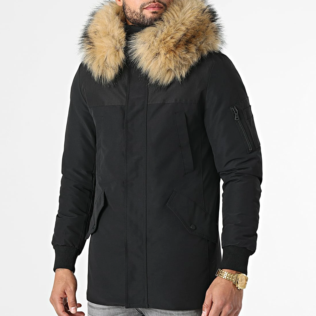 • Parka avec fourrure synthétique et poche zippée sur la manche
