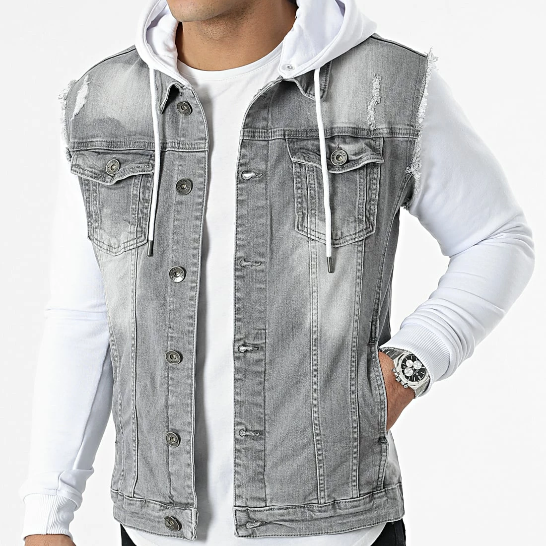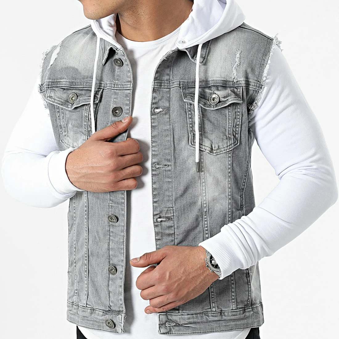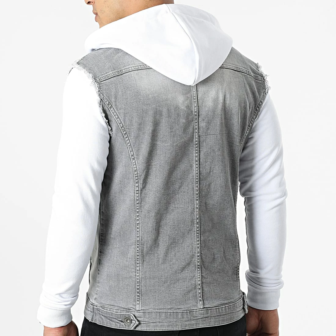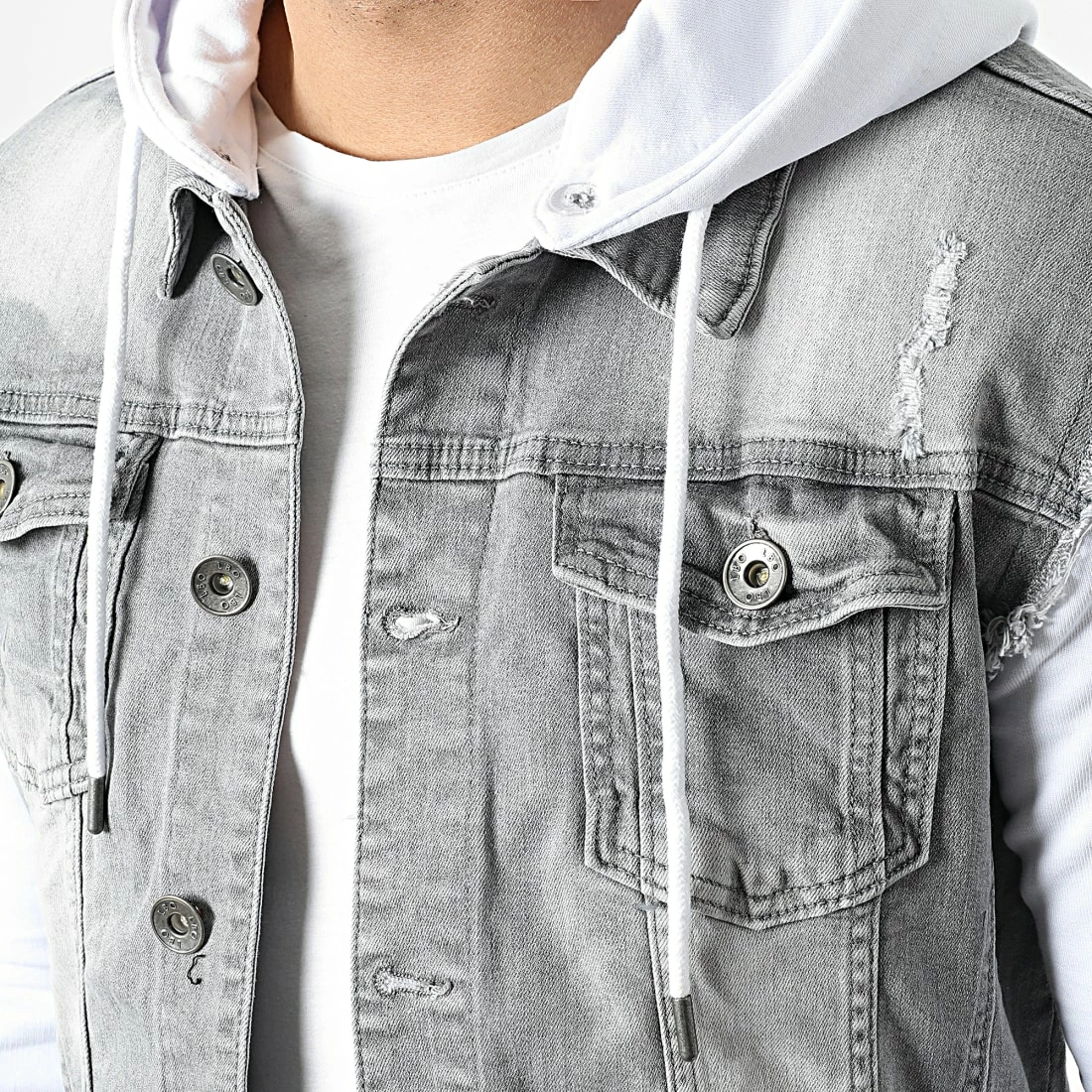 De gros 🎁 Veste Jean A Capuche 2261 Gris Denim Blanc de LBO 👍
