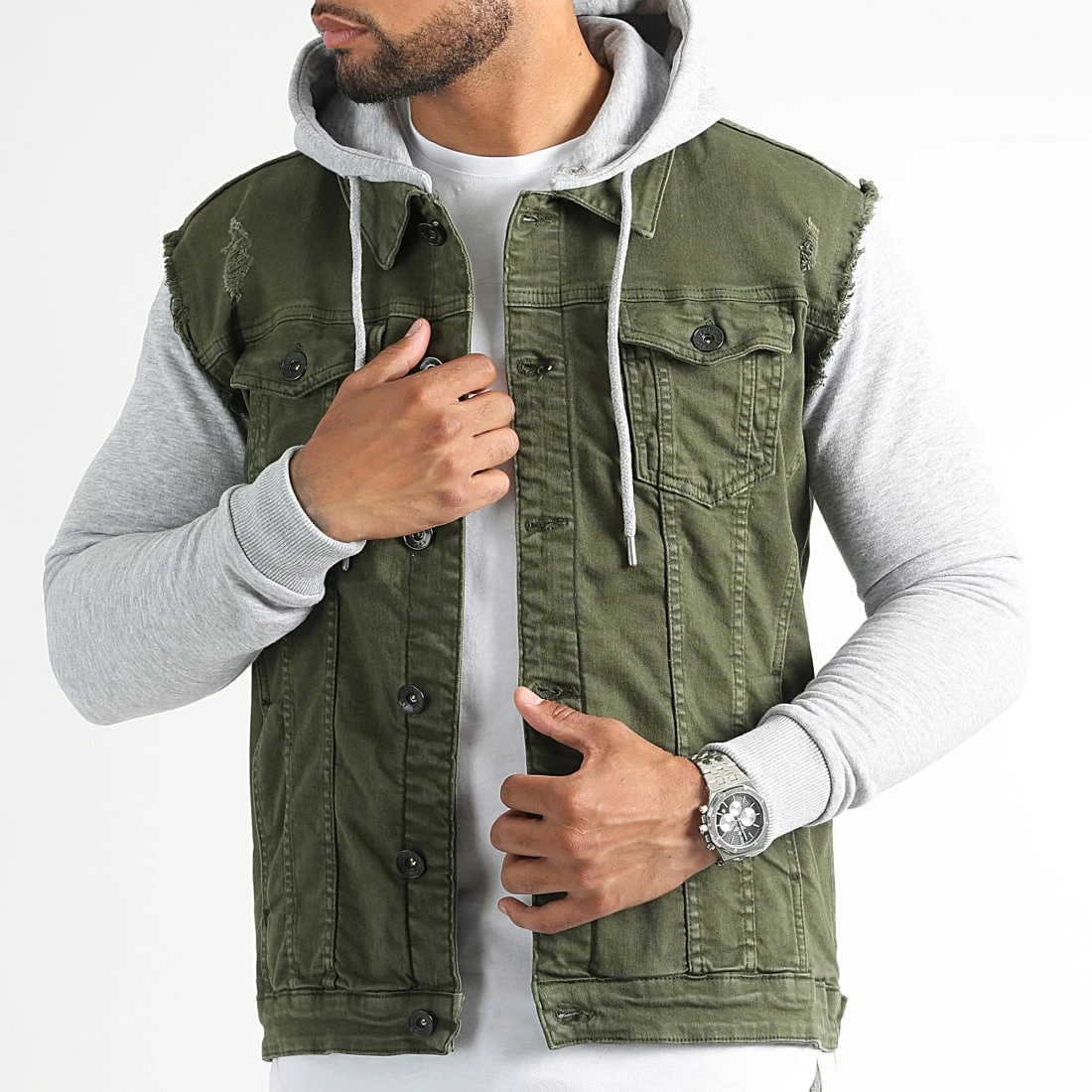 • Veste en jean bi-matière à capuche