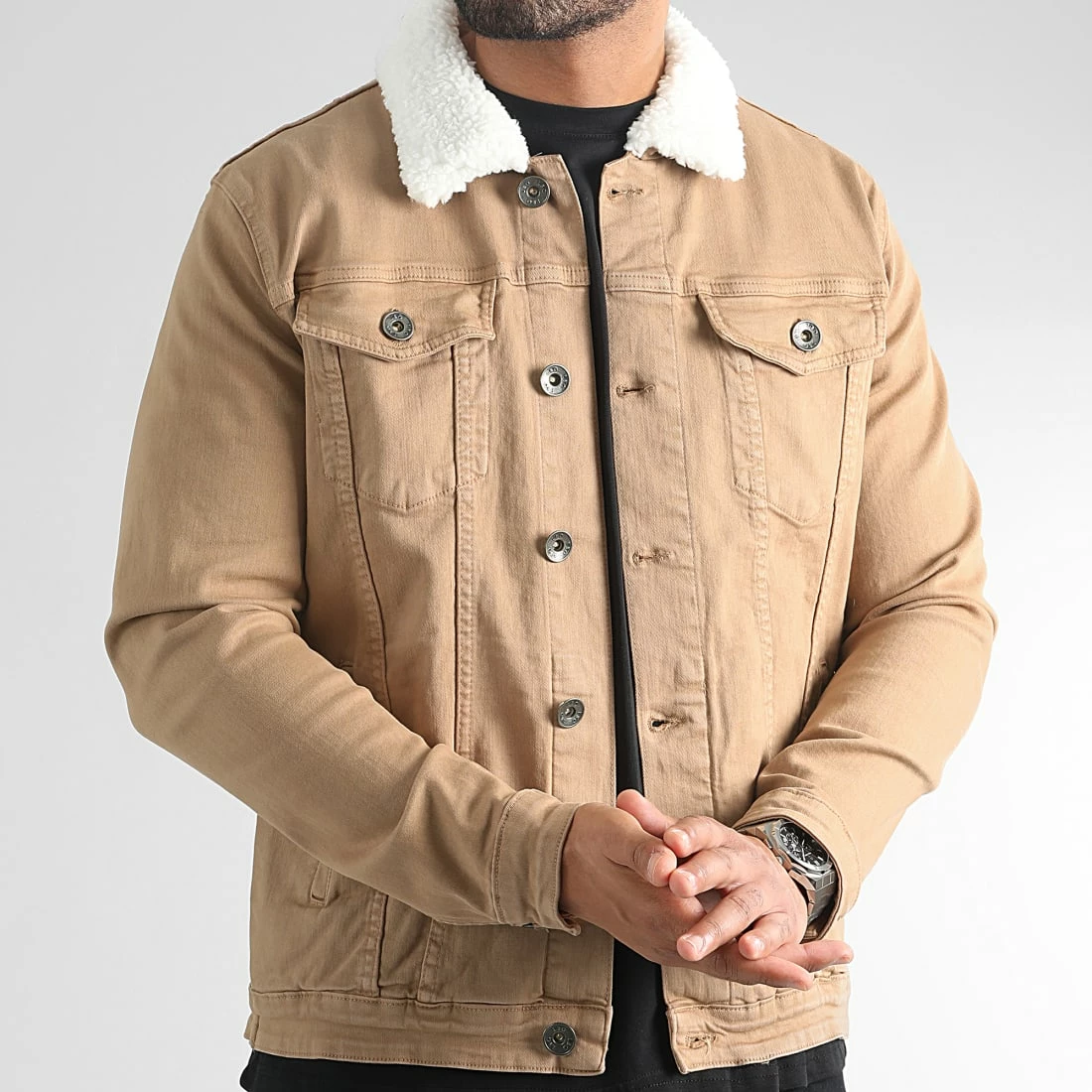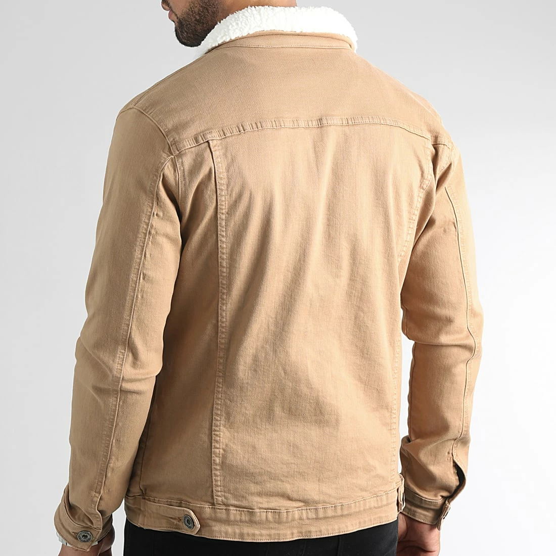 • Veste en jean en coton stretch avec col en fourrure synthetique mouton